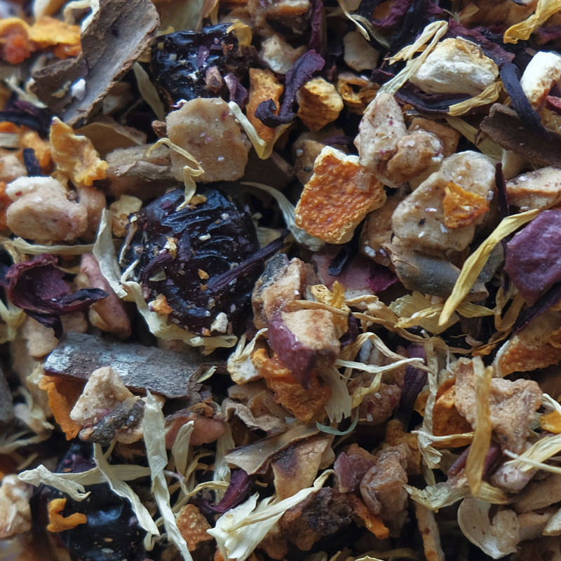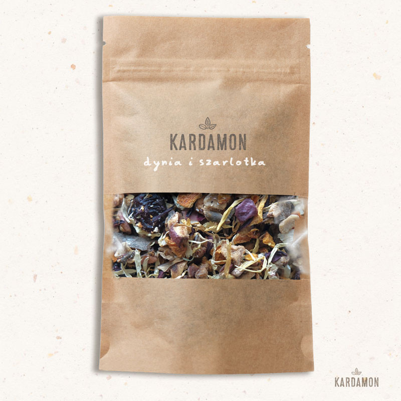 Składniki: płatki suszonego jabłka, suszone kawałki dyni, suszone płatki kwiatu hibiskusa, skórka pomarańczowa, kawałki cynamonu, żurawina suszona słodzona sokiem jabłkowym, aromat, płatki nagietka. Sposób przygotowania herbaty: aby uzyskać najbardziej wartościową herbatę weź 2-3 gramy herbaty i zalej 200 ml wody o temperaturze 90-95°C, odstaw na 4-5 minut. Rozkoszuj się smakiem i aromatem naturalnej herbaty.Przechowuj w szczelnym opakowaniu, w suchym i chłodnym miejscu.