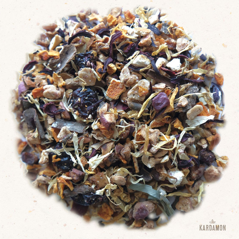 To pełna emocji mieszanka - każdy składnik ma w tej opowieści swoje pięć minut. Kwaśny hibiskus otwiera smakową narrację, intrygując i przykuwając uwagę. Gdy pozwolisz mu działać, ustępuje miejsca słodyczy wiśni - one odgrywają tu główną rolę, gwarantując głęboki, intensywny aromat i żywoczerwony kolor naparu.