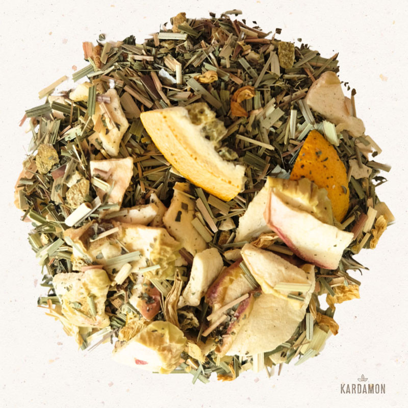 Składniki: jabłko suszone, trawa cytrynowa (26,5%), mięta, skórka cytryny (11%), pomarańcza liofilizowana, naturalny aromat, kwiat słonecznika, substancja konserwująca E223.