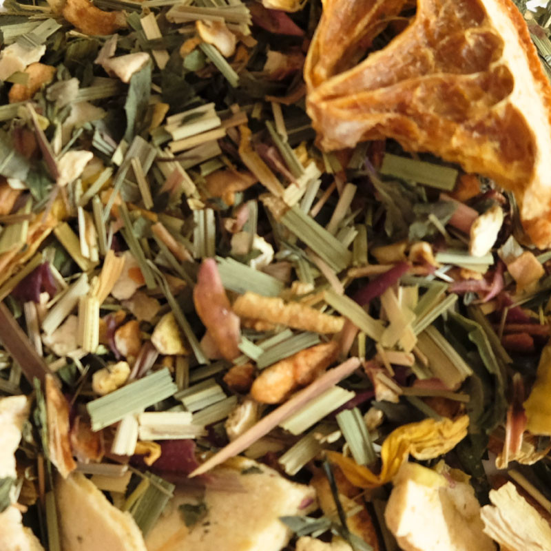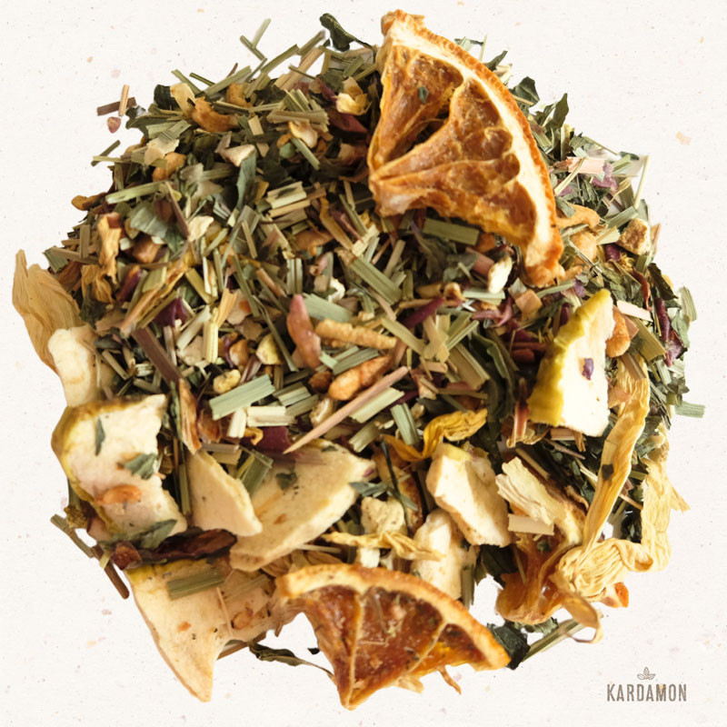 Składniki: trawa cytrynowa 24%, jabłko suszone, pomarańcza suszona (13%), skórka pomarańczy (10%), mięta, naturalny aromat, kwiat słonecznika, substancja konserwująca E223.