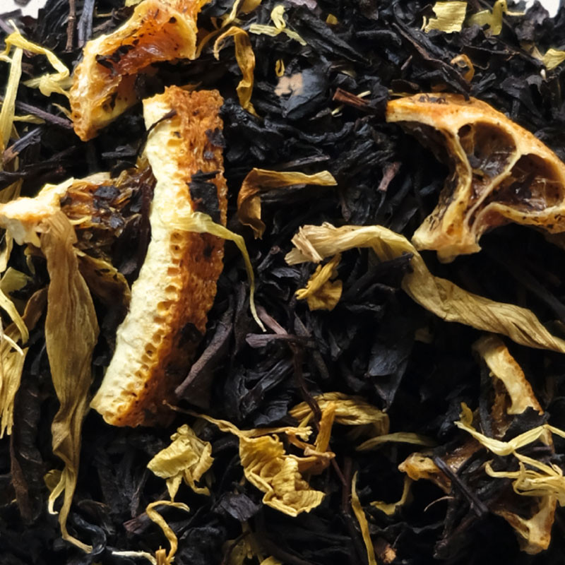 Składniki: herbata czarna Ceylon OP, aromat bergamotowy naturalny, pomarańcza suszona, płatki nagietka i słonecznika.