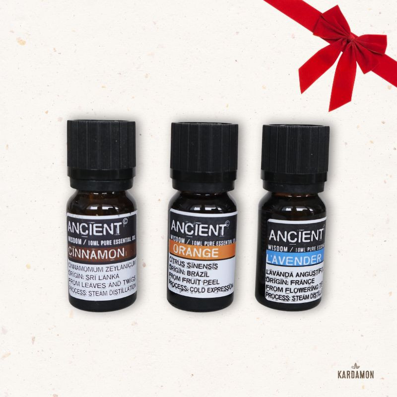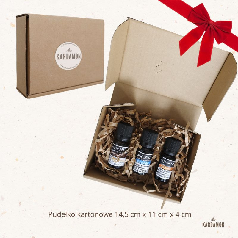 Zestaw prezentowy 6: 3 sztuki olejków eterycznych - cynamonowy, lawendowy, pomarańczowy.Całość zapakowana w kartonowe pudełko wielkości 14,5 cm x 11 cm x 4 cm